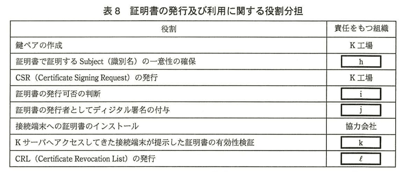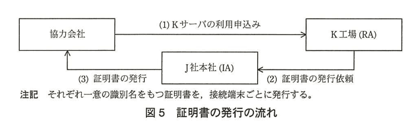 「IA(発行局)についてはJ社本社のプライベートCAを利用し、RA(登録局)についてはK工場が担当する。」