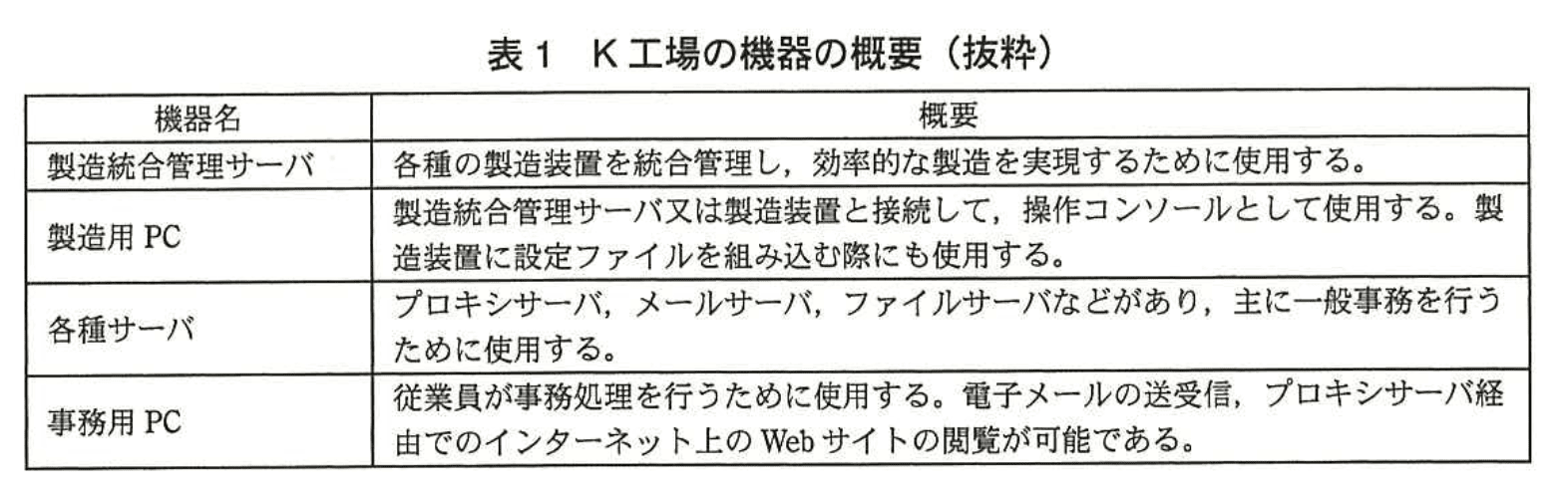 J社は金属製品製造会社である。J社の主力工場であるK工場は、20年前に開設されて以来、製造ラインで様々な製品を生産しており、現在400名の従業員が働いている。K工場では合理化の一環として、製造装置のLAN接続を進めていた。