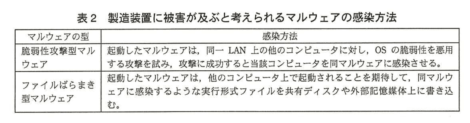 事務系LANに接続しているときに転送用PCがこのマルウェアに感染すると、物理切替で製造系LANへつなぎ替えた瞬間に、転送用PCが感染源として動作し「OSの脆弱性を悪用する攻撃」を製造系LAN内の「製造装置」へ仕掛けます。したがって製造装置への感染を防止できません。 -