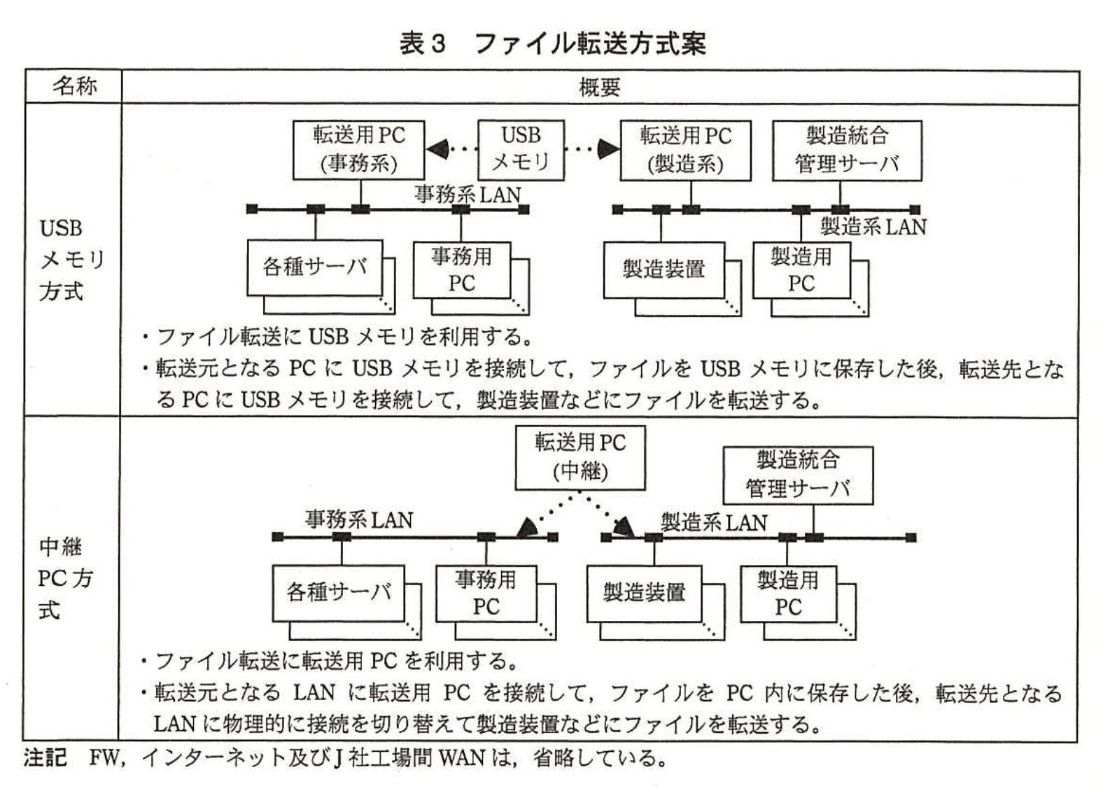 表3には「転送元となるLANに転送用PCを接続して…転送先となるLANに物理的に接続を切り替えて製造装置などにファイルを転送する。」とあります。つまり同じPCが「事務系LAN」と「製造系LAN」の両方に順番に接続される運用です。 -