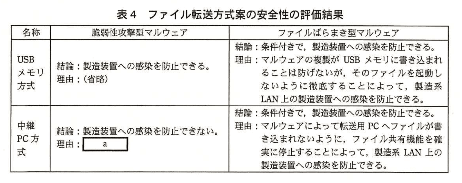 ・表3のファイル転送方式案について安全性の評価をしたところ、結果は表4のようになった。