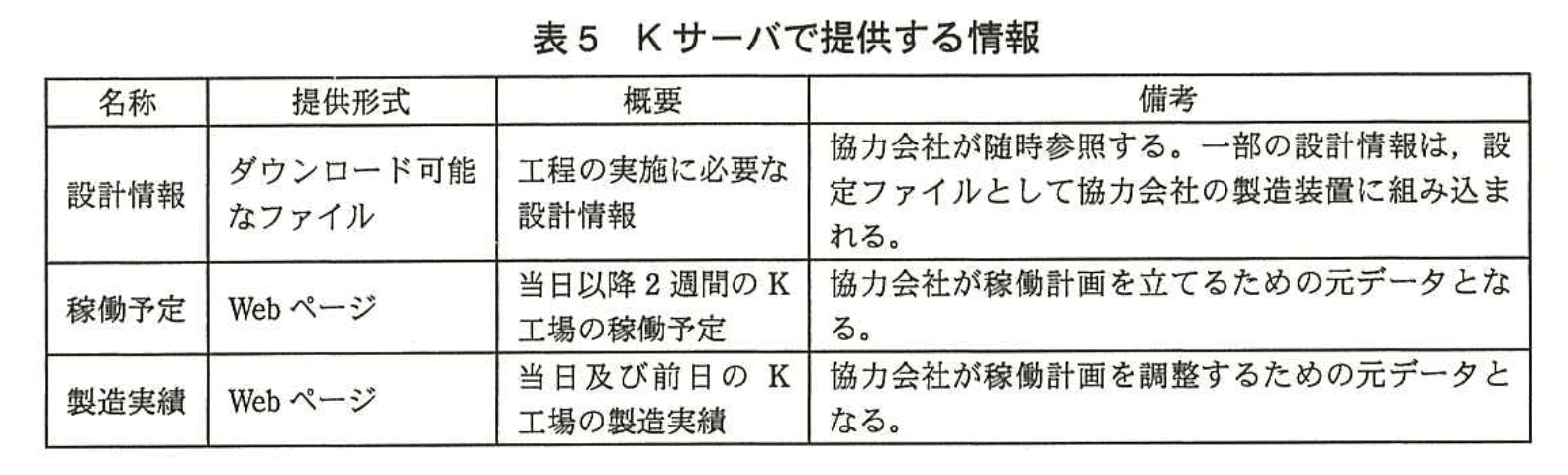 これらを受けて、生産管理部では、K工場から協力会社へ向けて情報を提供するために、情報共有サーバ(以下、Kサーバという)を構築することが決定された。設計・構築は、Pさんをリーダとしたチームで行うこととなった。またKサーバの運用も、生産管理部で行うこととなった。Kサーバで提供する情報は、表5のとおりである。