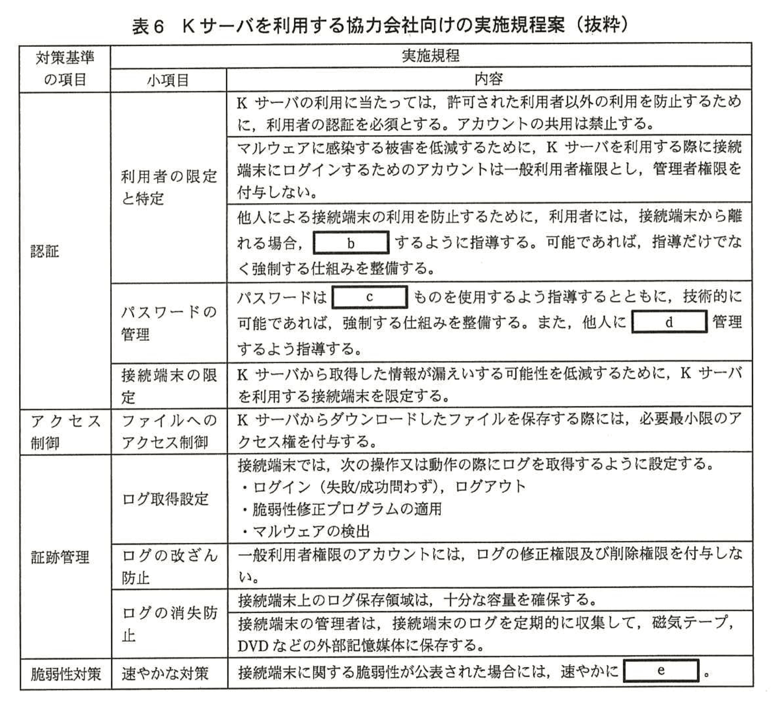 対策基準を確認したPさんは、Kサーバの審査に向けた準備を開始するとともに、Kサーバを利用する協力会社向けの実施規程案の作成に取り掛かった。作成に当たり、実施規程の対象者は、協力会社の情報システム部門のシステム管理者を想定した。Pさんは、Q主任の支援を受けながら実施規程案の作成を完了し、情報システム課の事前確認を受けた上で情報セキュリティ委員会に提出した。実施規程案のうち、Kサーバにアクセスするために利用するPC(以下、接続端末という)の管理に関する部分を表6に示す。