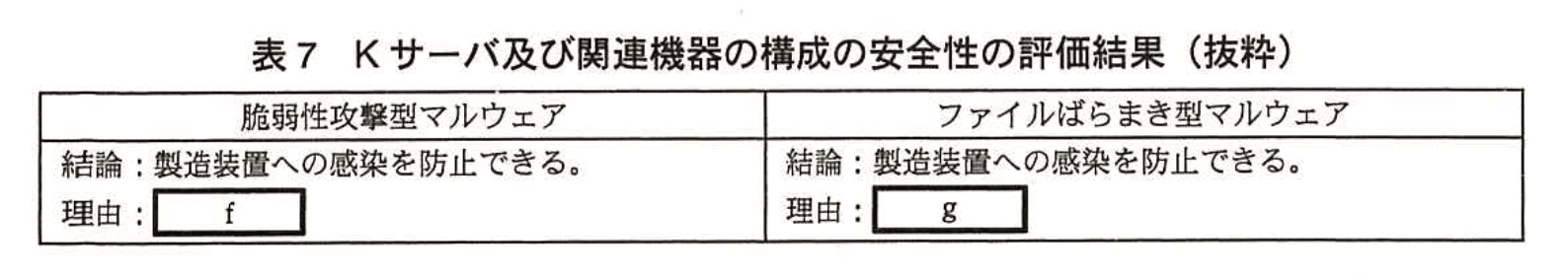 Pさんは図4の構成において、Kサーバを経由した製造装置へのマルウェアの感染を防止できるかどうかを評価した。そのうち、協力会社の接続端末が表2のマルウェアに感染した場合に限定し、そのマルウェアが情報共有系LANまで到達したという状況を仮定した場合の評価結果は、表7のとおりである。