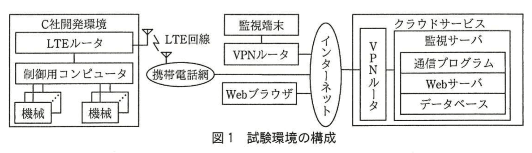開発担当のE君は、工場遠隔監視システムの試験環境(以下、試験環境という)を構築した。試験環境の構成を図1に示す。