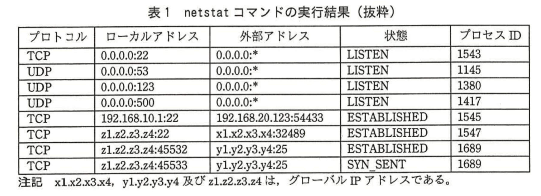 - netstat の「ローカルアドレス」「外部アドレス」の区別を取り違え、c を “z1.z2.z3.z4” と誤記するケースが散見されます。