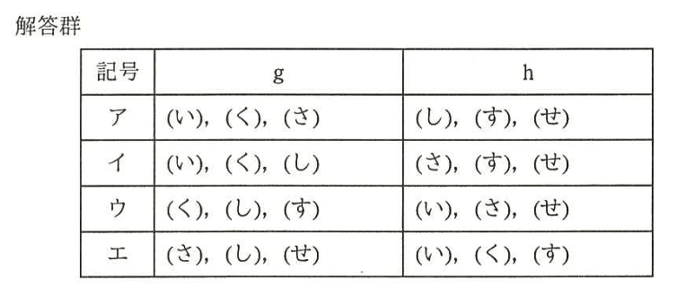 (2)表2中のg 、hに入れる記号の適切な組合せを、解答群の中から選び、記号で答えよ。