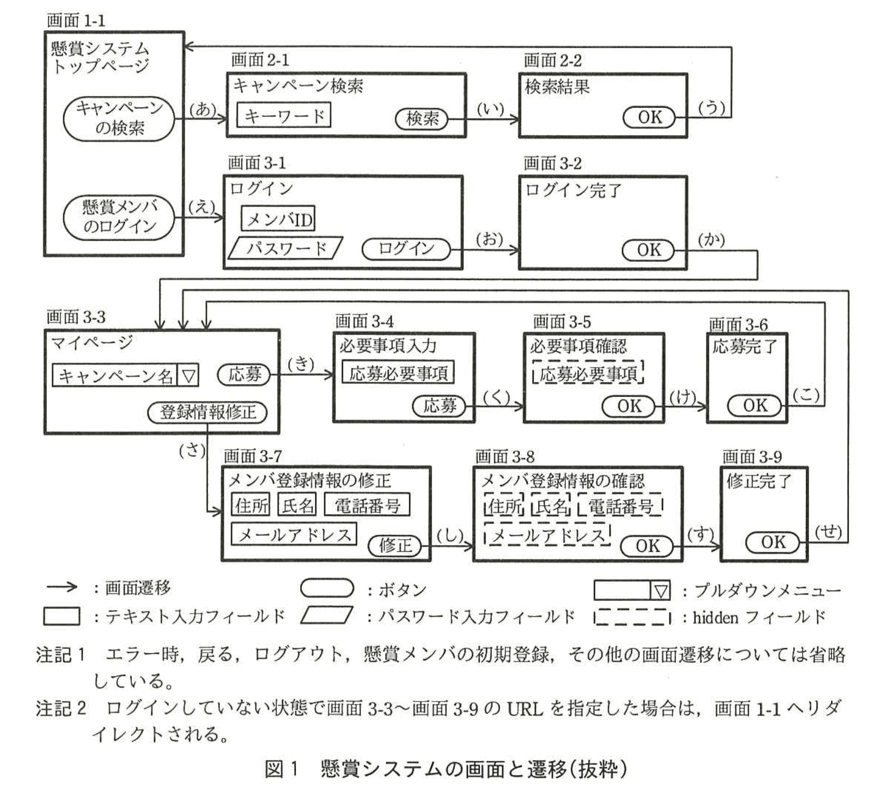 L社では、懸賞システムの画面と遷移について、図1の案を作成した。