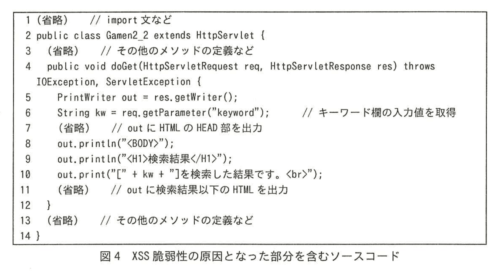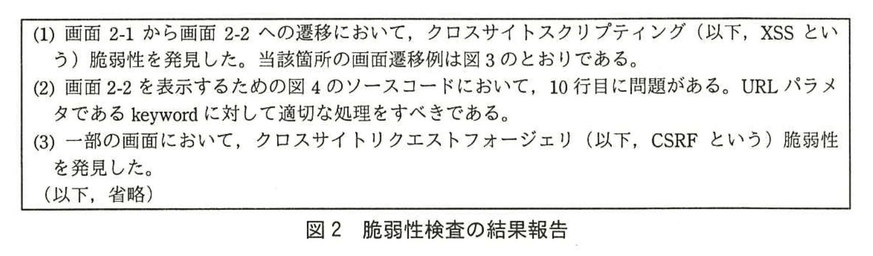 - 図2の報告では「画面2-1から画面2-2への遷移において、クロスサイトスクリプティング(以下、XSSという)脆弱性を発見した」と指摘され、図4のソースコード 6 行目で req.getParameter("keyword") を取得し、10 行目で無加工表示しているため「keyword」パラメタが攻撃面であることが分かります。