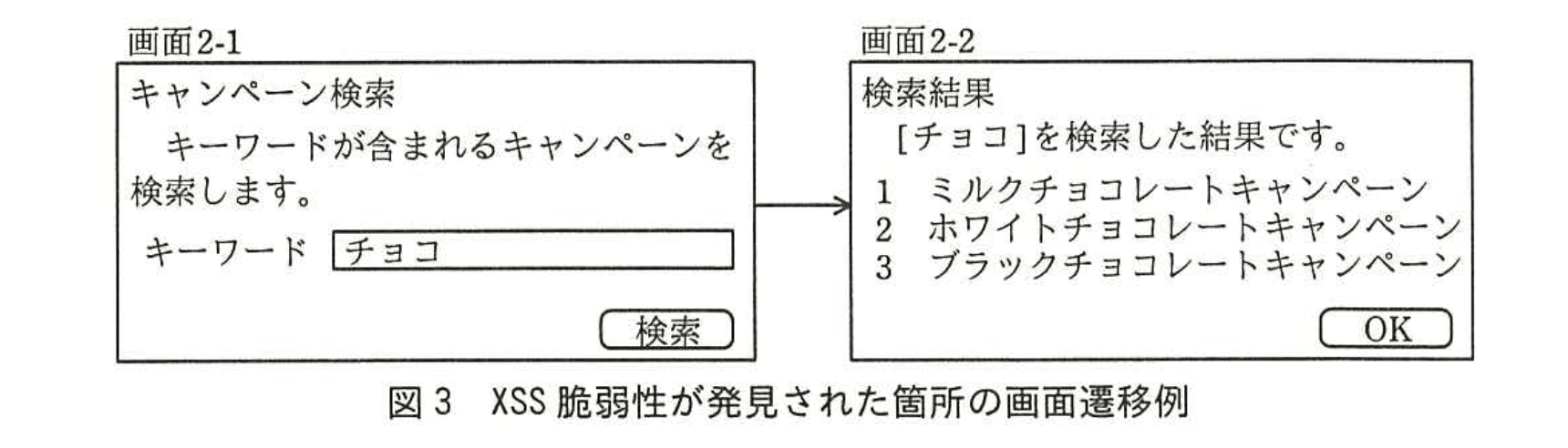 - つまり攻撃者は 「画面2-1」を経由せずに 被害者のブラウザを直接 “https://kensho.m-sha.co.jp/Gamen2_2” に遷移させ、keyword に悪意ある値を渡します。