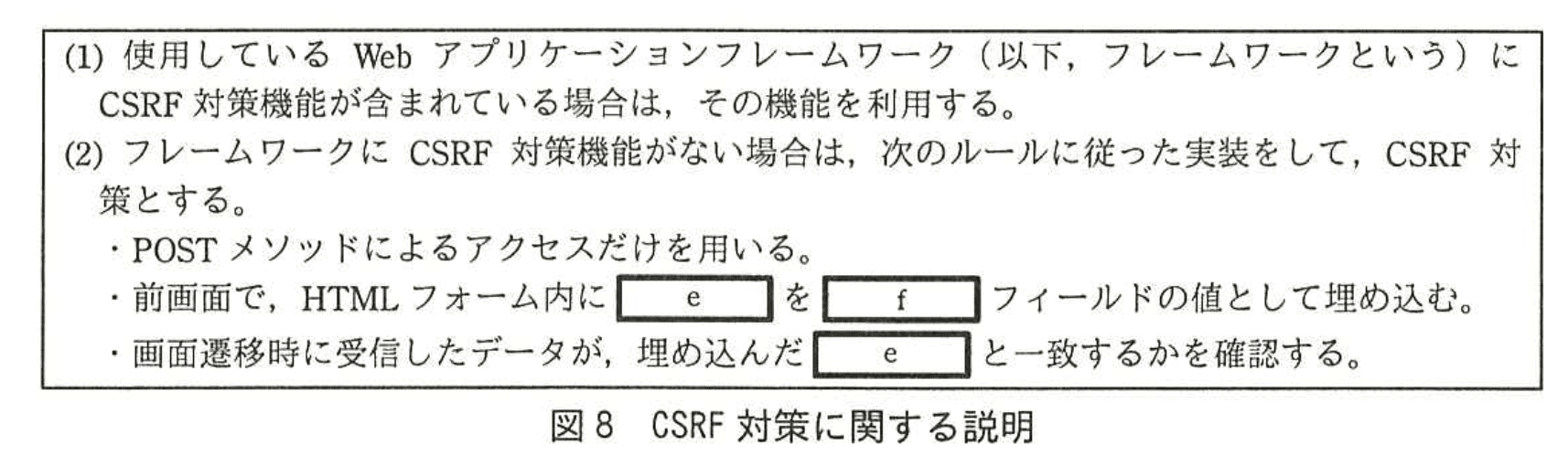 - 「セッションID」をそのままeに使うと考えると失点します。図8は“前画面で埋め込み、次画面で一致確認”と書かれており、セッションIDは既にCookieで送信されているため趣旨が異なります。