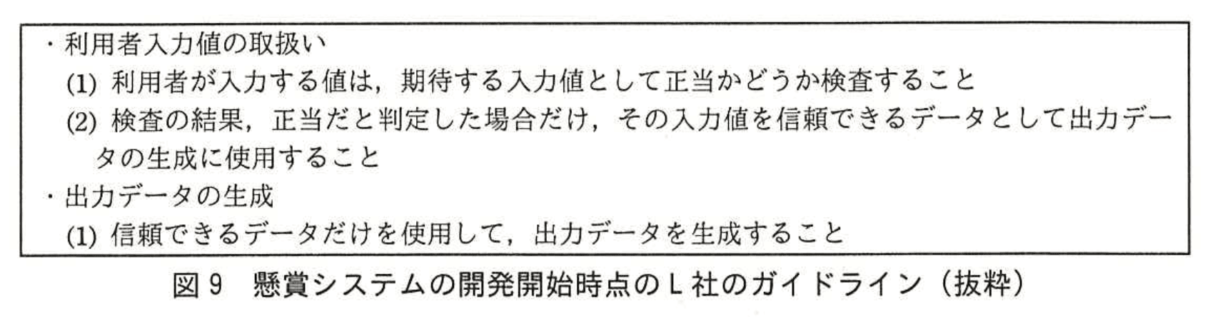 - 図9のガイドラインは「利用者が入力する値は、期待する入力値として正当かどうか検査すること」と規定していましたが、検査場所の明示がありませんでした。