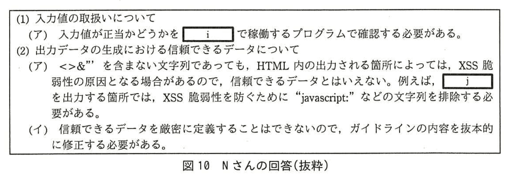 - この経緯を踏まえ、N さんは図10で「入力値が正当かどうかを i で稼働するプログラムで確認する必要がある」と指摘しています。