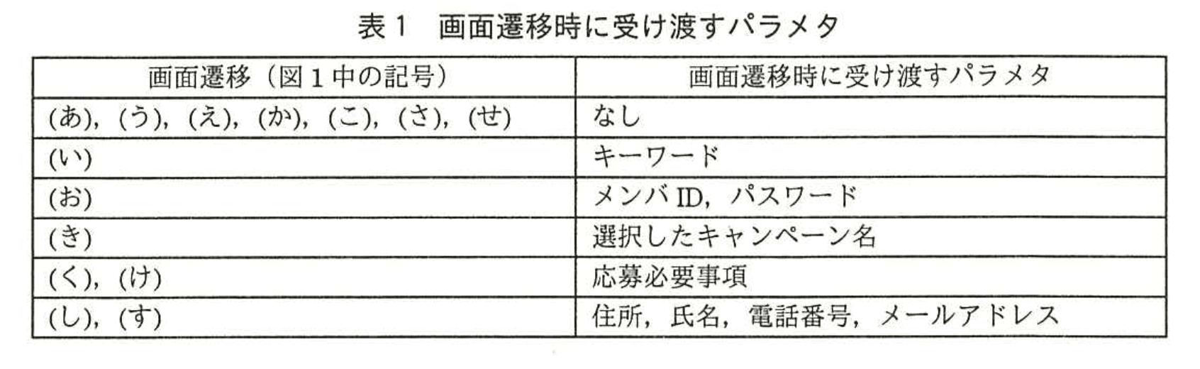 図1中の矢印で示す画面遷移時に受け渡すパラメタを表1に示す。ただし、セッション維持に関するパラメタは省略している。