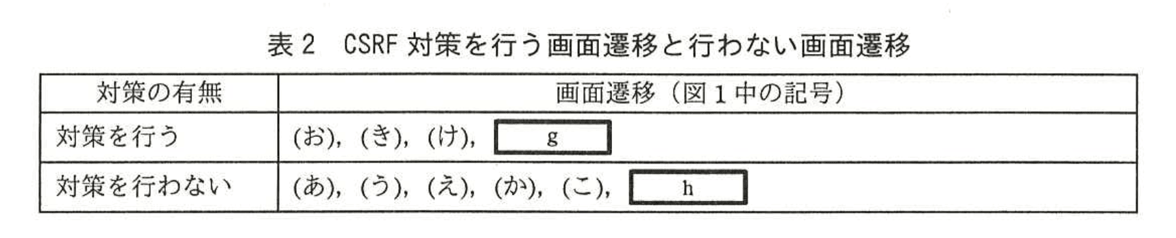 Nさんの説明を受けて、L社では懸賞システムについて、CSRF対策を行う画面遷移と行わない画面遷移を、表2のように決定した。