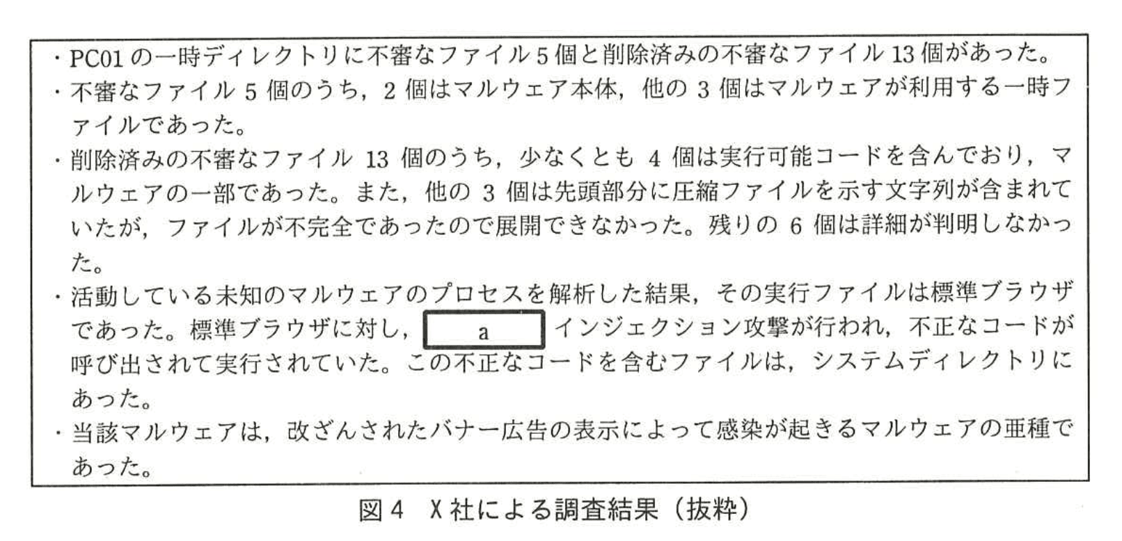 Cさんは、PC01の調査をセキュリティ専門業者のX社に依頼した。X社による調査結果は図4のとおりであった。