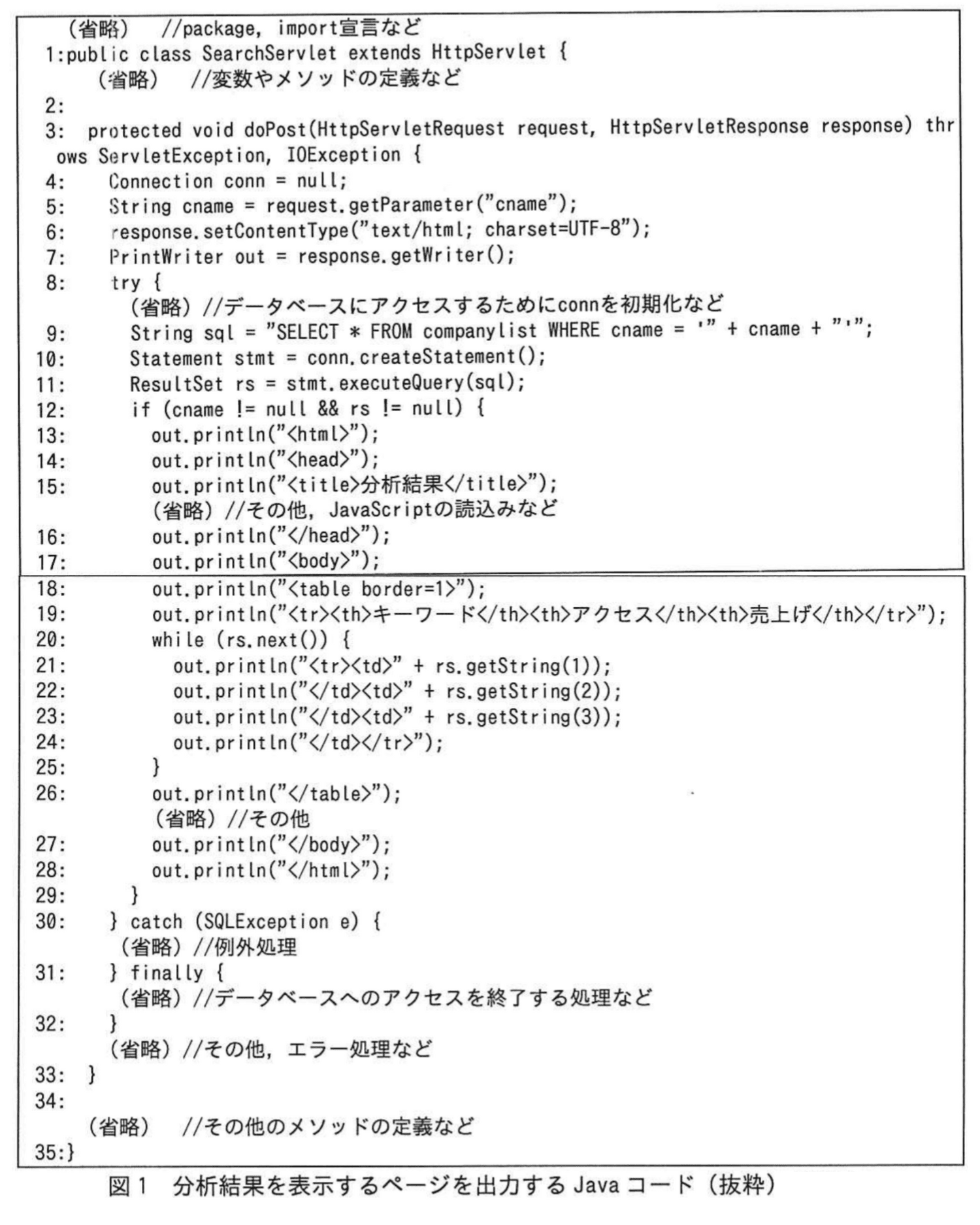 - 図1では out.println で HTML を生成しており、次の行が該当します。
