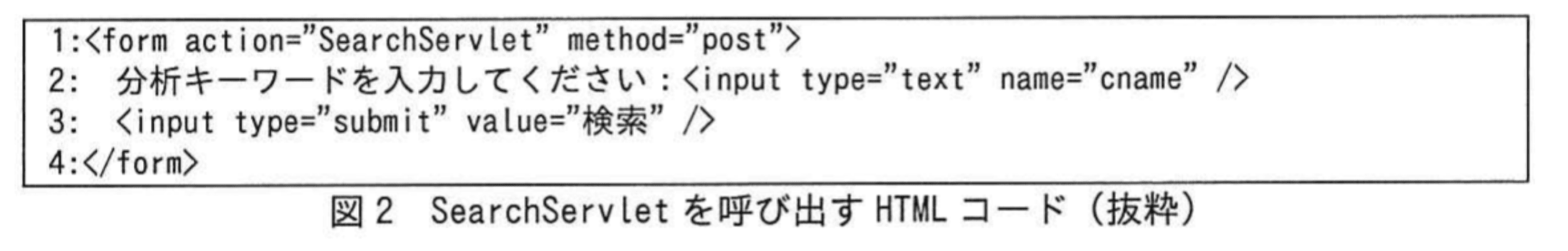 まず、N氏が脆弱性検査ツールを使って本番システムを検査したところ、図1のJavaコードで書かれたサーブレットSearchServletに、SQLインジェクション脆弱性及びクロスサイトスクリプティング(以下、XSSという)脆弱性があることが判明した。図2は、図1のSearchServletを呼び出すHTMLコードである。