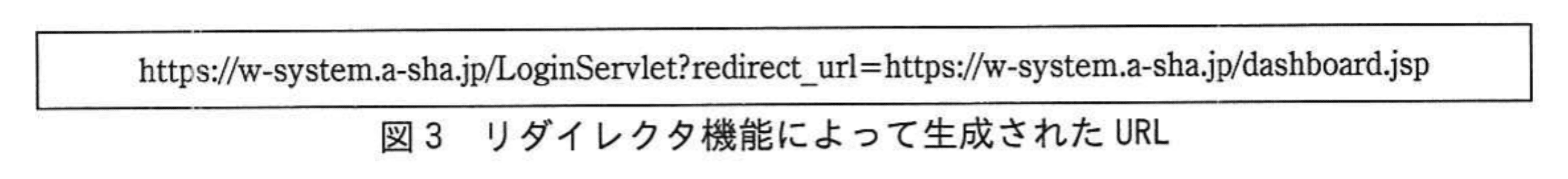 以前のWシステムは、ログイン状態で30分間操作しないと、サーバ側で自動的にログアウトする仕様であった。自動的にログアウトした場合、ログアウト直前のページを閲覧するには、再度ログインをして、ダッシュボードページから所望のページを選択する必要があるので、不便だとの指摘が顧客からあった。これを改善するため、自動的にログアウトした場合に、ログアウト直前のページの閲覧を試みると、一旦はログインページに遷移するが、認証が成功すると、閲覧を試みたページへリダイレクトする機能(以下、リダイレクタ機能という)を導入した。例えば、WシステムのURLである https://w-system.a-sha.jp/ で動作するWebアプリケーションにおいて、Wシステムにログインしていない状態で、https://w-system.a-sha.jp/dashboard.jsp というURLにアクセスすると、図3のように生成されたURLへリダイレクトされる。