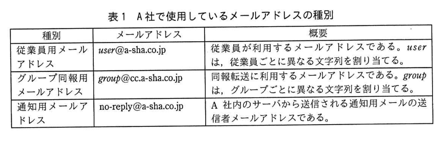 A社では、業者とデータを交換する場合、ファイルを、あらかじめ取り決めたパスワードで暗号化し、メールに添付して送受信している。さらに、担当者不在の場合でも迅速に対応できるように、担当者が所属するグループの同報用メールアドレスにもメールを送信してもらっている。グループ同報用メールアドレスに届いたメールは、グループに所属する従業員全員のメールアドレスに転送(以下、同報転送という)される。A社で使用しているメールアドレスの種別を表1に示す。