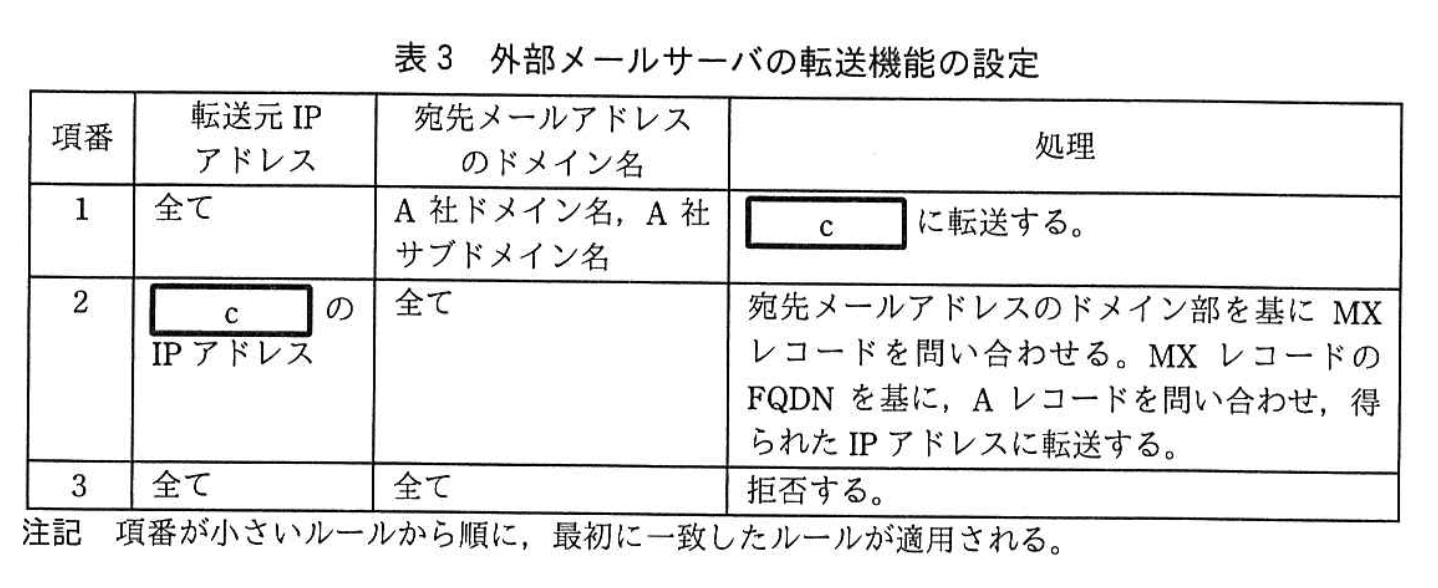 - 【問題文】表2「外部メールサーバ」の転送機能に