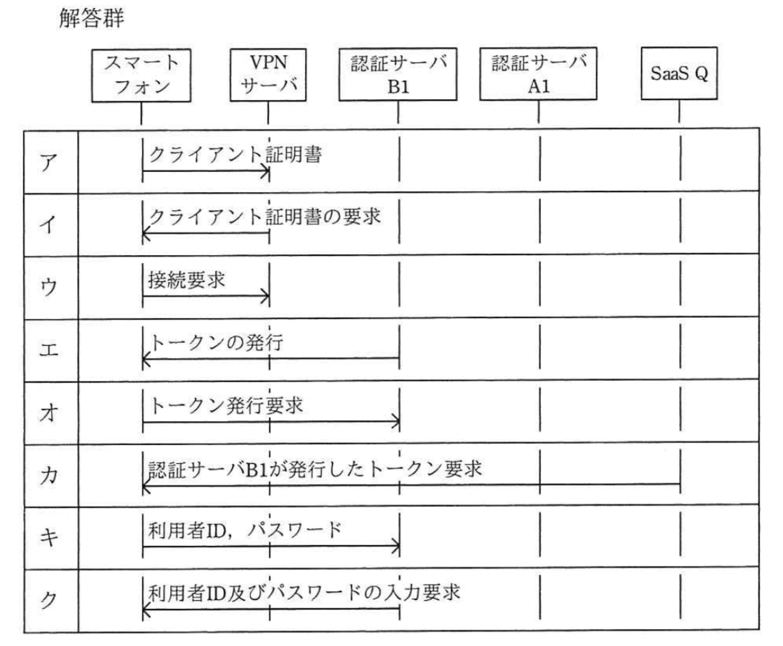 ・よって VPN サーバは認証サーバ B1 に対して「認証サーバB1が発行したトークン要求」(行 カ)を出し、これが a になります。 -