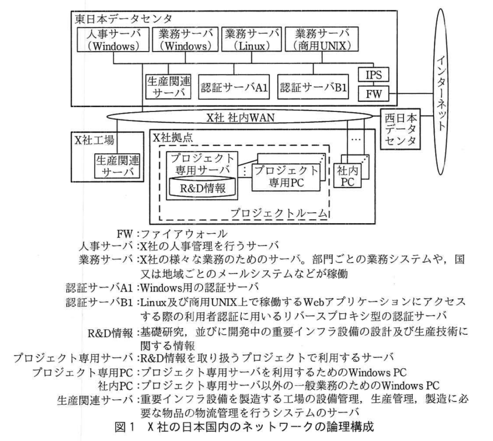 X社は、日本、米国、欧州に事業を展開している従業員数 80,000 名の製造会社であり、重要インフラ設備を製造している。日本国内の従業員数は40,000名である。X社のシステムは、サーバ、ネットワーク機器及びPCで構成されている。X社の日本国内のネットワークの論理構成を、図1に示す。