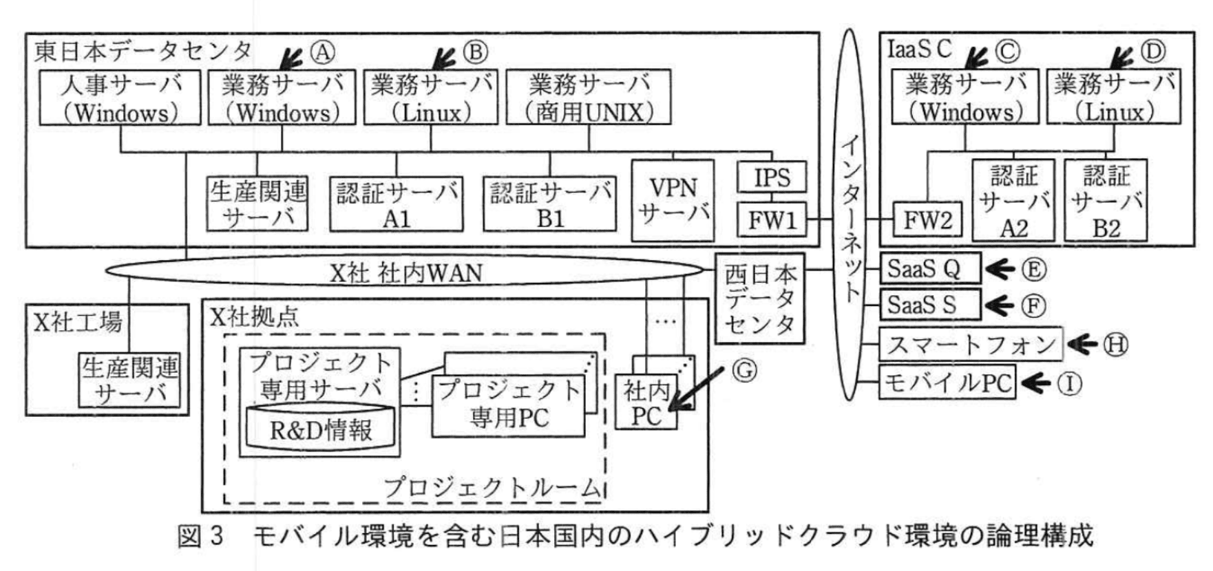 ・引用:「モバイル端末が、X社のデータセンタに接続した後、認証サーバB1による利用者認証が行われ…トークンが発行された後、従業員は、IaaS C…にアクセスできる。」