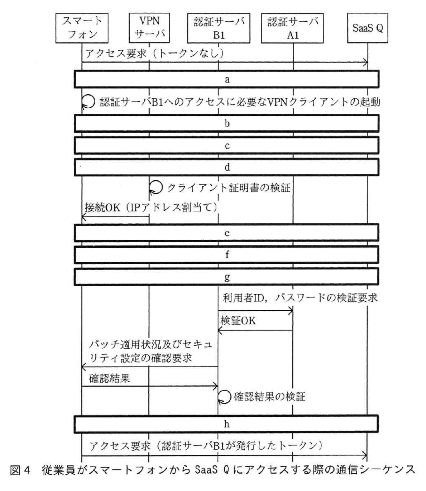 図3において、従業員がスマートフォンからSaaS Qにアクセスする際の通信シーケンスを図4に示す。
