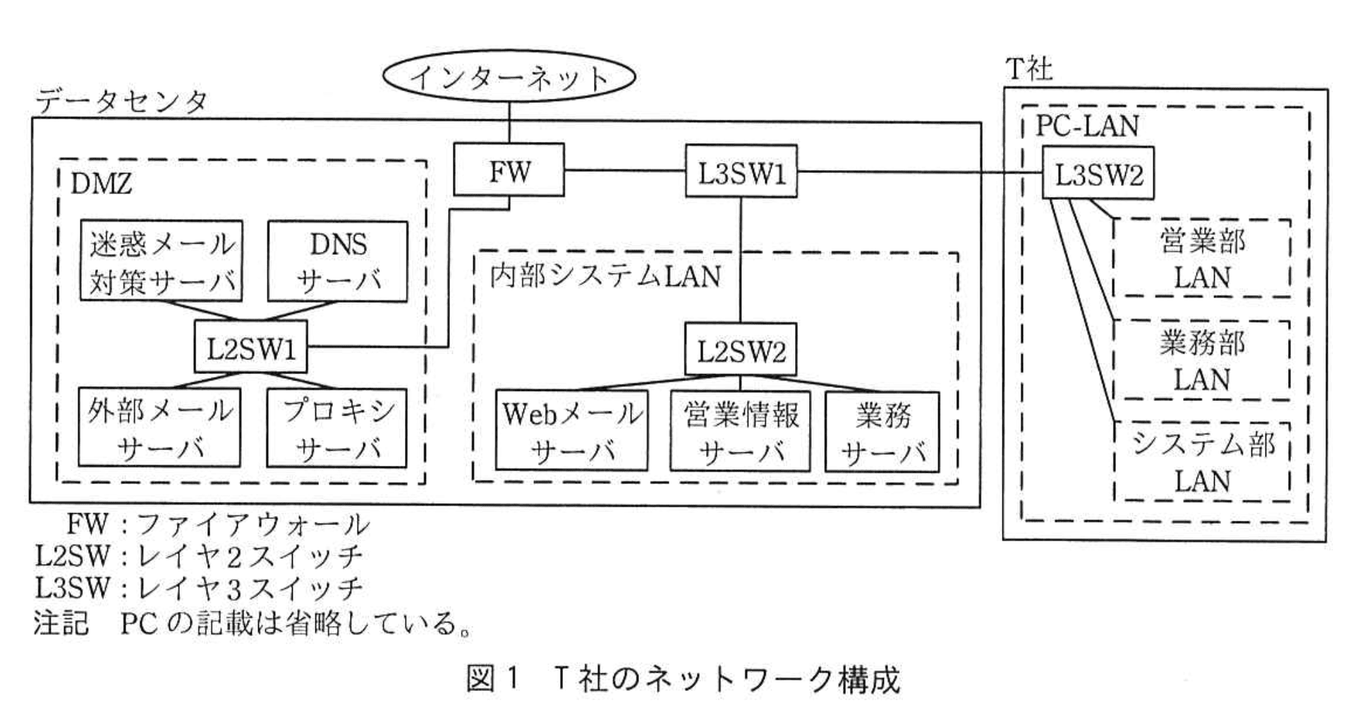 T社では、電子メール(以下、メールという)の送受信及びWeb閲覧にインターネットを利用している。T社のドメイン名は、t-sha.co.jp(以下、T社ドメイン名という)である。また、全ての従業員は、T社ドメイン名のメールアカウントをもつ。