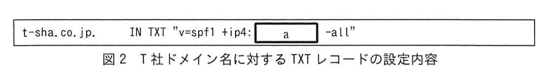 - 【問題文】図2に「t‐sha.co.jp. IN TXT ”v=spf1 +ip4:a -all”」とある。