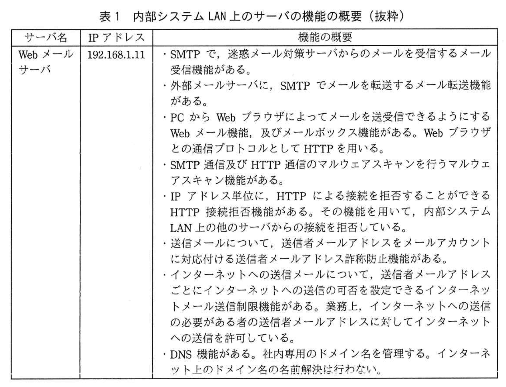 - 表1「Web メールサーバ」には「『外部メールサーバに、SMTP でメールを転送するメール転送機能がある。』」という仕様があります。