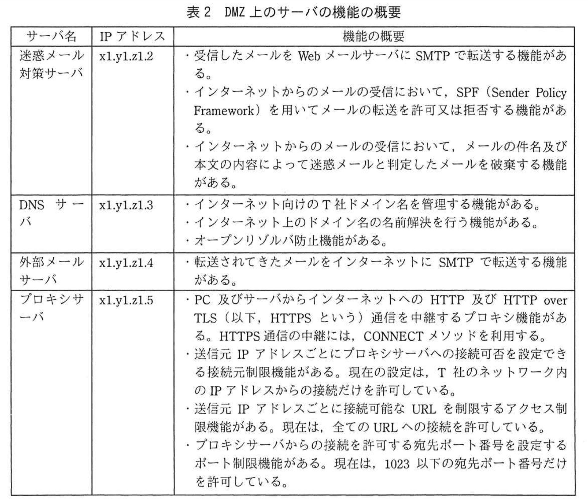 DMZ上のサーバの機能の概要を表2に示す。表2に示す機能は全て有効にしている。