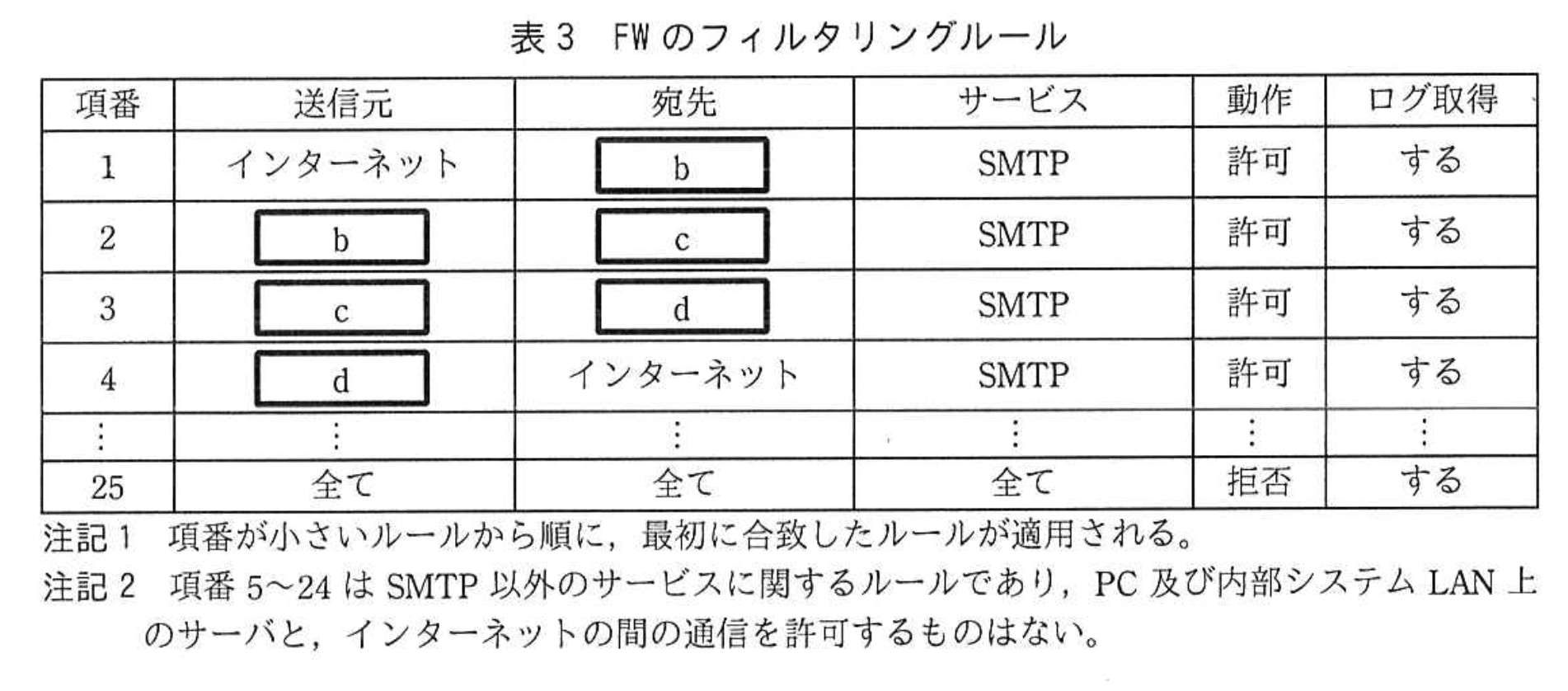 FW は、ステートフルパケットインスペクション型である。そのフィルタリングルールを表3に示す。
