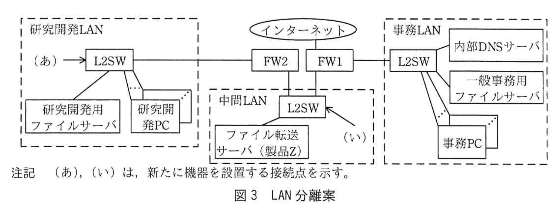 ・「図3中の(い)」は中間LAN側で、研究開発LANとは「FW2」、事務LANとは「FW1」で分離されます。 -