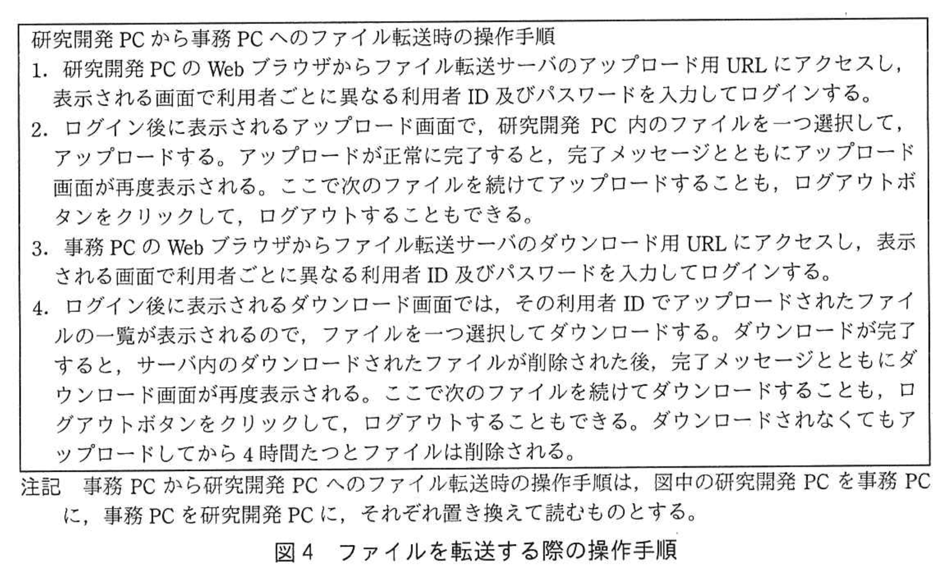 「研究開発PCのWebブラウザからファイル転送サーバのアップロード用URLにアクセスし、表示される画面で利用者ごとに異なる利用者ID及びパスワードを入力してログインする。」