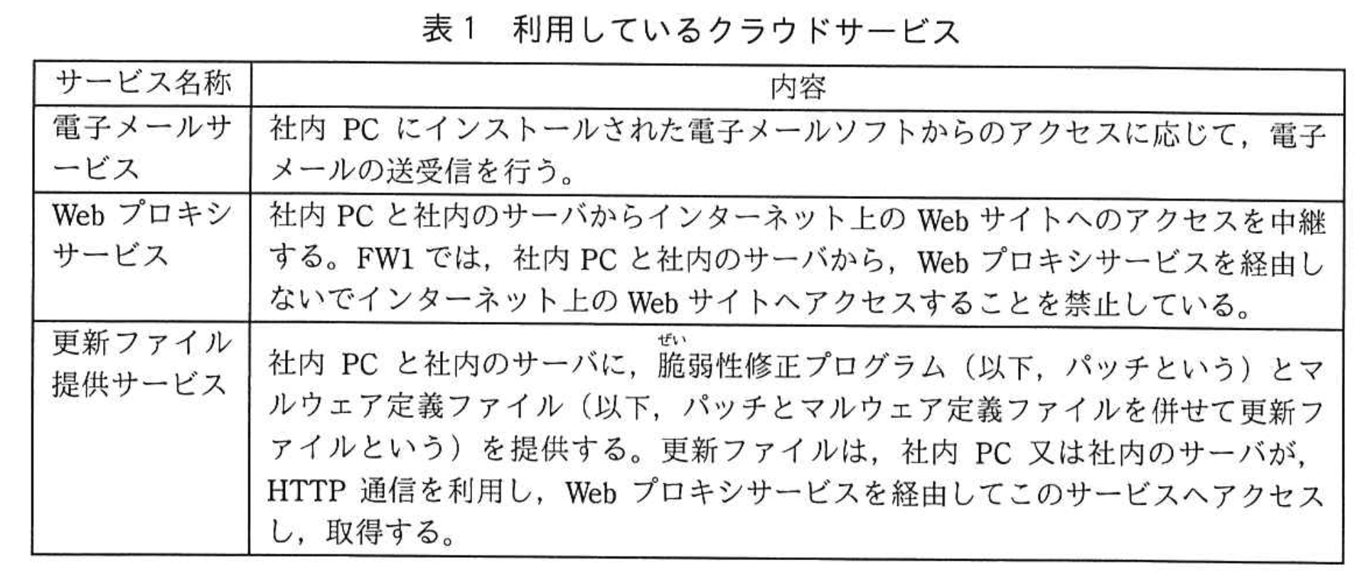N社は、新薬創出を事業内容とする、いわゆる創薬ベンチャ企業である。従業員は10名で、研究開発員が5名、その他の事務員が5名である。N社のネットワーク構成を図1に示す。図1中の全ての機器には固定のIPアドレスを割り当てている。また、インターネット経由でN社が利用しているクラウドサービスを表1に示す。