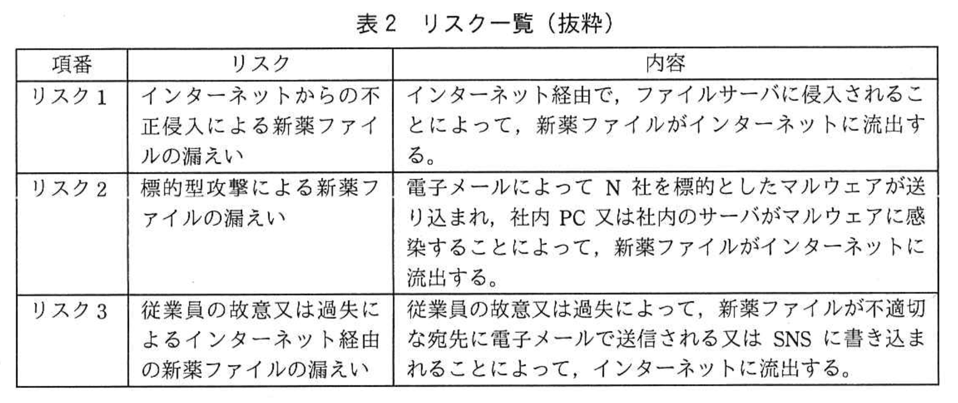 B取締役とRさんは、A氏の支援の下でaのプロセスを完了した。その結果、新薬ファイルに影響を及ぼすリスクの一覧として表2が得られた。