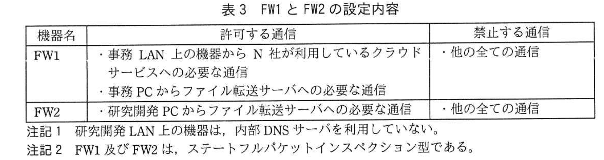 感染経路「研究開発 PC から配信サーバへ」を考えると、 【問題文】「FW2 の設定内容…研究開発PCからファイル転送サーバへの必要な通信」以外は「他の全ての通信」を禁止とあります。