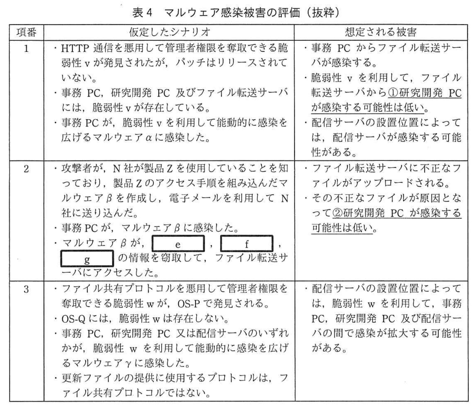- 表4の項番2に「マルウェアβが、e、f、gの情報を窃取して、ファイル転送サーバにアクセスした。」とある。