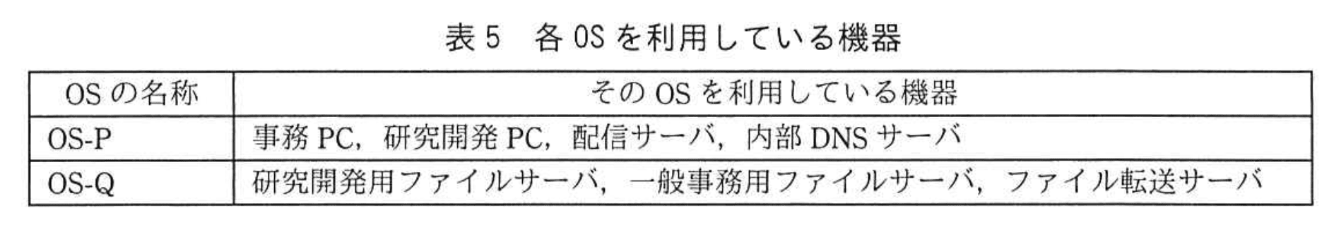 図3、表3及び図4を見たA氏は、幾つかのシナリオを仮定して図3のLAN構成で想定されるマルウェア感染被害について表4のとおり評価した。表5に、各OSを利用している機器を示す。