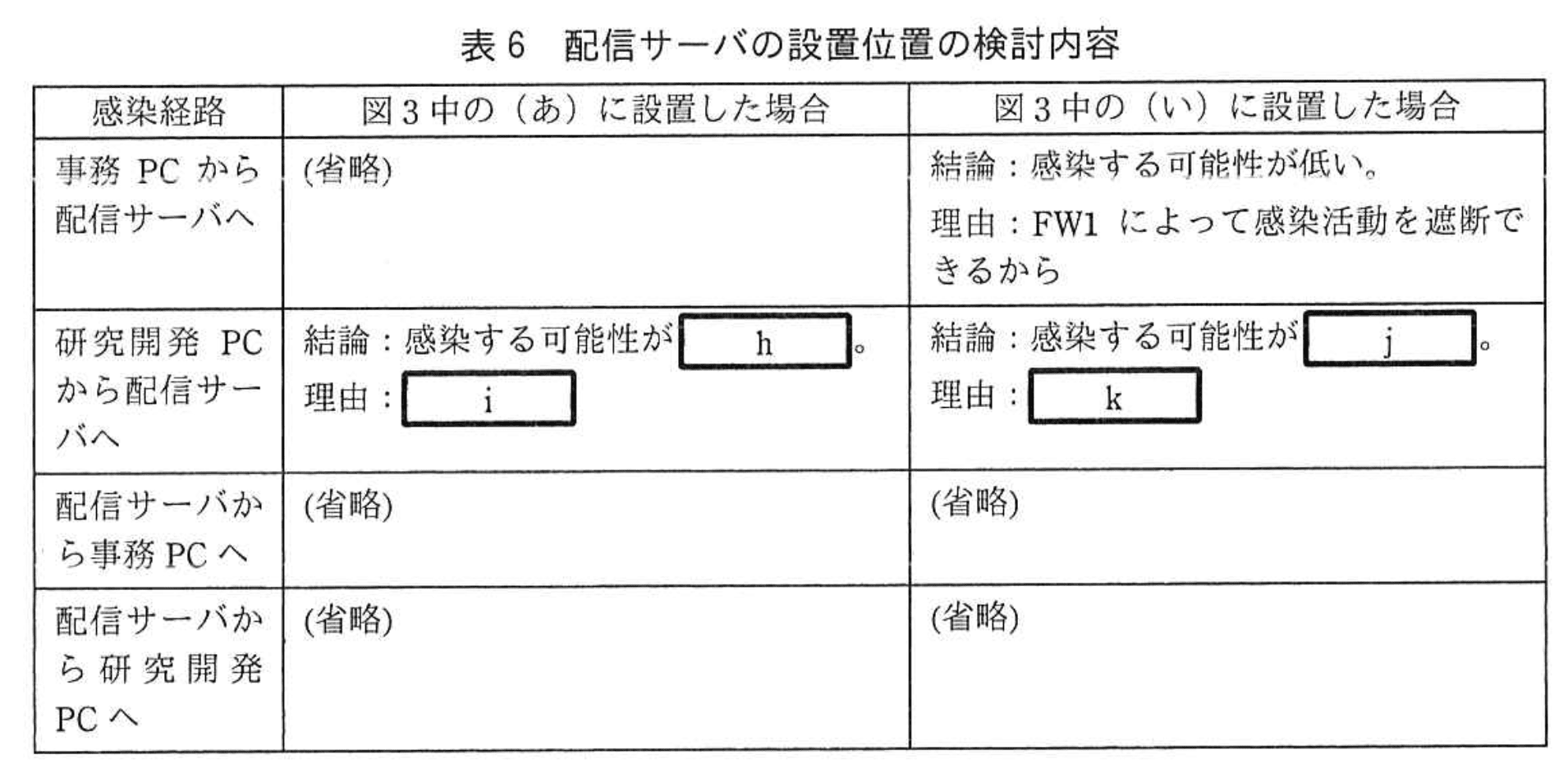 さらに、表4の項番3について、マルウェアの感染が広がることを防ぐために、Rさんは配信サーバの設置位置を、表6を用いて検討した。検討の際に、FW1とFW2の設定は必要最小限の通信だけを許可するものとした。