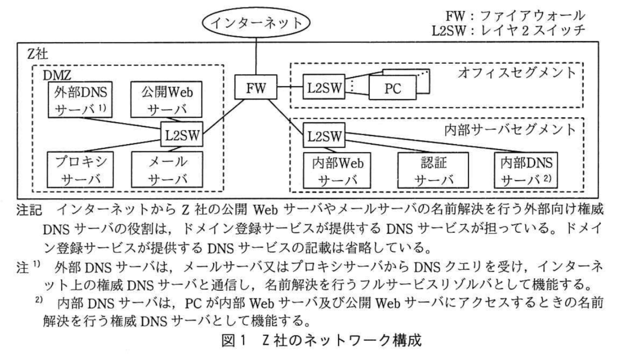 表2 より、DMZ 内の「外部DNSサーバ」はフルサービスリゾルバとして機能し、「メールサーバ」や「プロキシサーバ」など DMZ 内機器の名前解決を担当しています。したがって、インターネットへ直接 DNS クエリを出す必要があるのは DMZ のみです。オフィスセグメントや内部サーバセグメントは内部 DNS を利用すべきで、インターネットへの直接問い合わせは不要です。 -