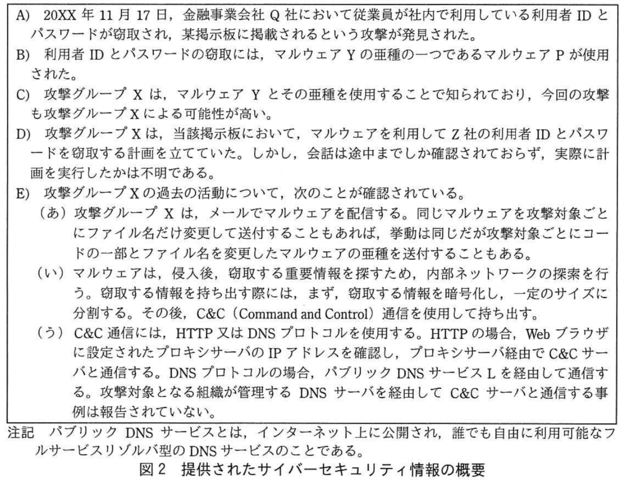 20XX年11月19日、Z社はISACから、サイバーセキュリティ情報の提供を受けた。当該情報の概要を図2に示す。