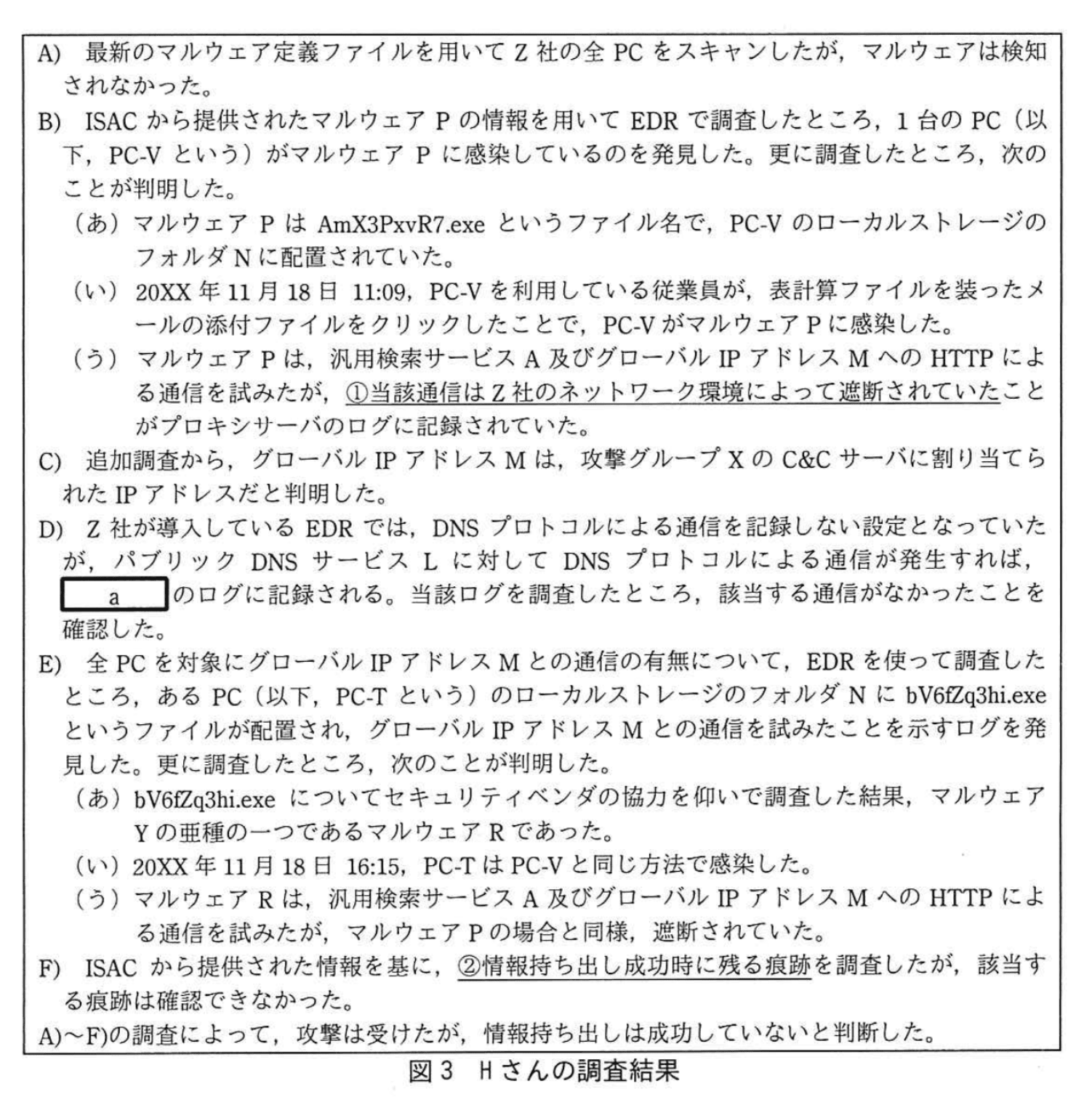 【問題文】図2 E(う) に「C&C通信には、HTTP又はDNSプロトコルを使用する。」とあります。したがってマルウェアが情報を外部へ送出する際は、①HTTP で C&Cサーバ(=「グローバルIPアドレスM」)へ、②DNS で「パブリックDNSサービスL」へ通信が発生します。 - Z社の実際の調査結果