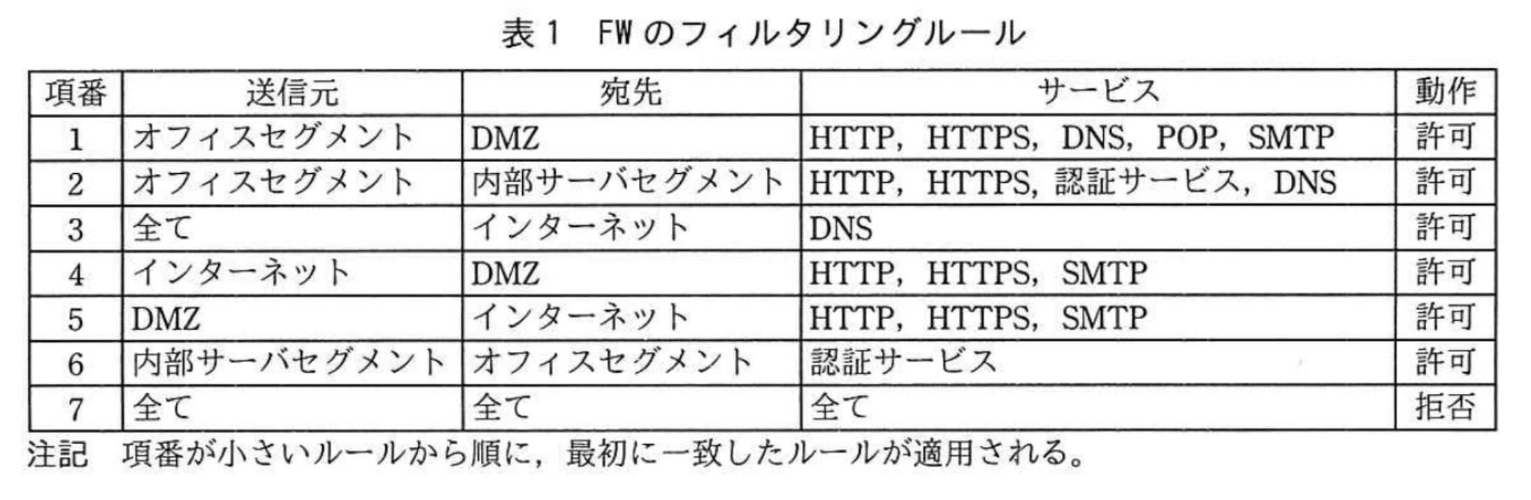 FWのフィルタリングルールを表1に、図1中に記載された機器の詳細を表2に示す。