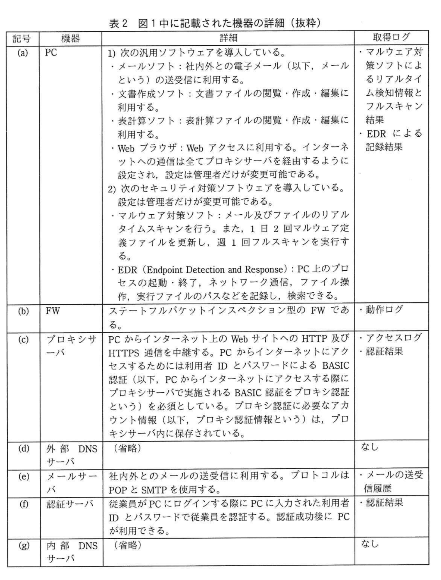 - (c) プロキシサーバ:HTTP/HTTPSを中継し、取得ログは「アクセスログ」「認証結果」。DNSは対象外。