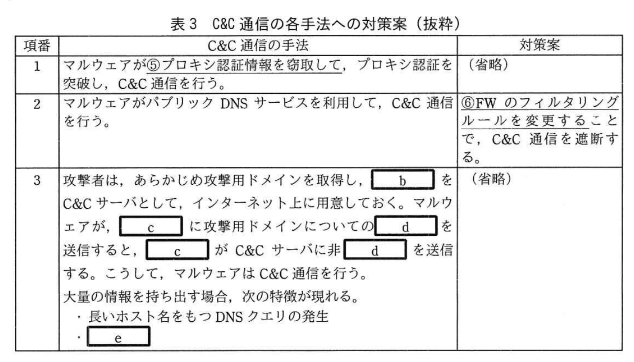 - 【問題文】の表3で、DNSを使う C&C 手法について